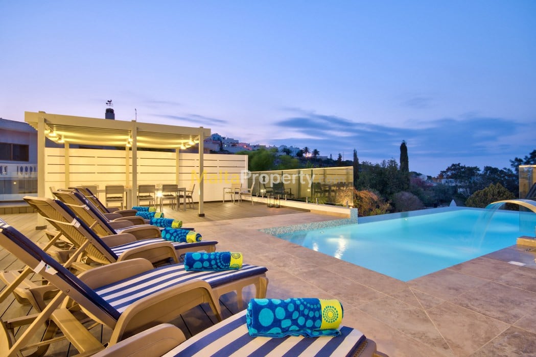 Introducing our newest gem - a contemporary four-bedroom villa in Mellieha's prestigious Santa Maria Estate, offered by Luxury Villas Malta. This luxurious residence blends modern amenities with minimalist design, featuring a spacious open-plan kitchen, dining, and living area. The ground floor includes a sleek family bathroom and access to a private spa oasis with a heated pool, jacuzzi, sauna, and billiards table.