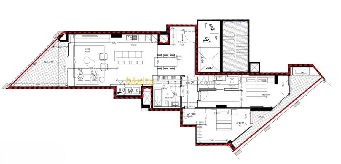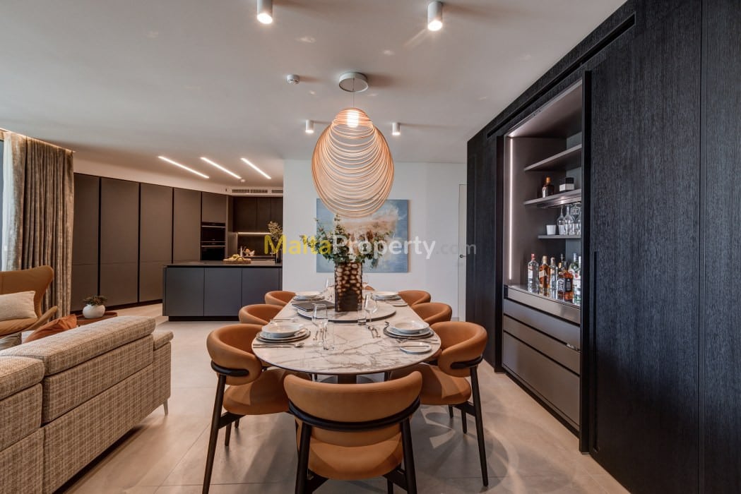 The apartment features two generously sized bedrooms, including a master suite with an ensuite bathroom, complemented by a main bathroom and a convenient utility room. The open-plan kitchen, dining, and living area creates a warm and versatile space for relaxation or entertaining, enhanced by a separate powder room for added practicality.